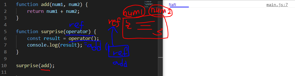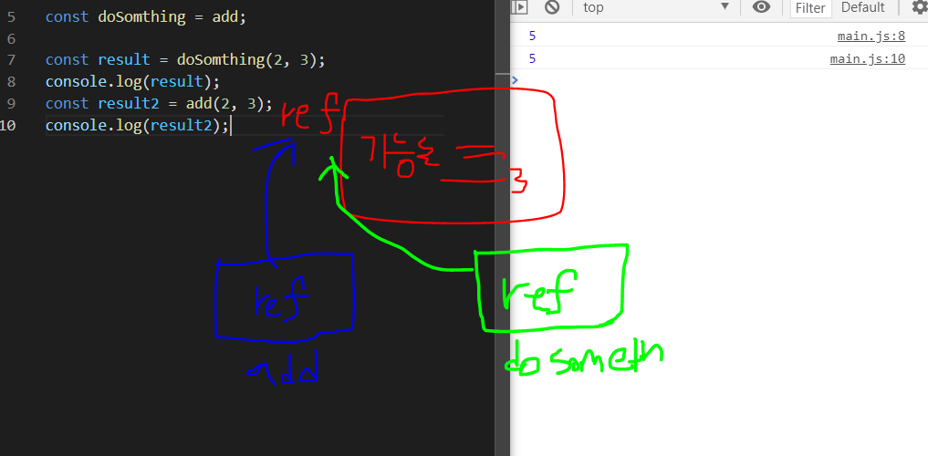 doSomething이라는 변수가 add와 똑같은 기능의 레퍼런스를 가리키게 된다.