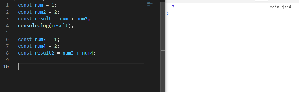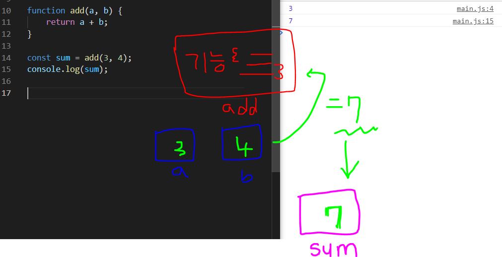 sum이라는 변수는 add함수에 3, 4의 인자를 전달해주는 것.
