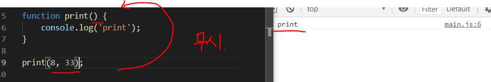 인자는 무시되고 함수식인 'print'만 콘솔로그에 출력된다.