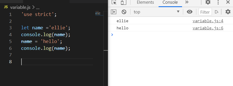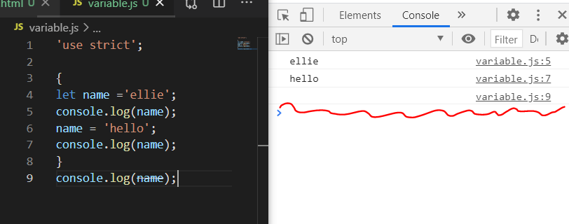 { }밖에 있는 console.log(name);은 아무 것도 나타나지 않음.