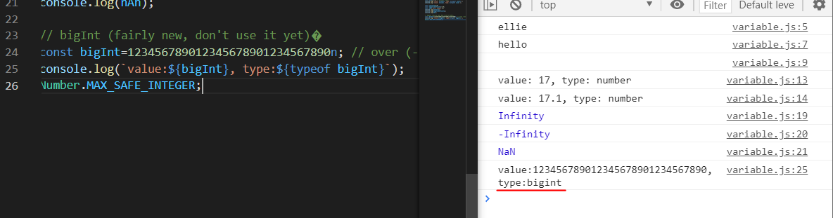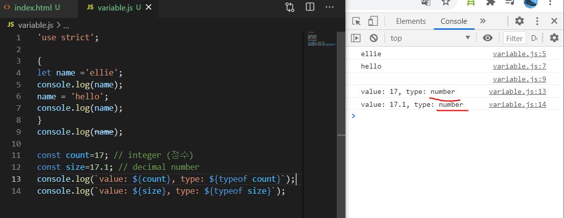 (다른 언어와 달리 javascript는) 정수나 소수점에 상관없이 number type으로 할당 됨.