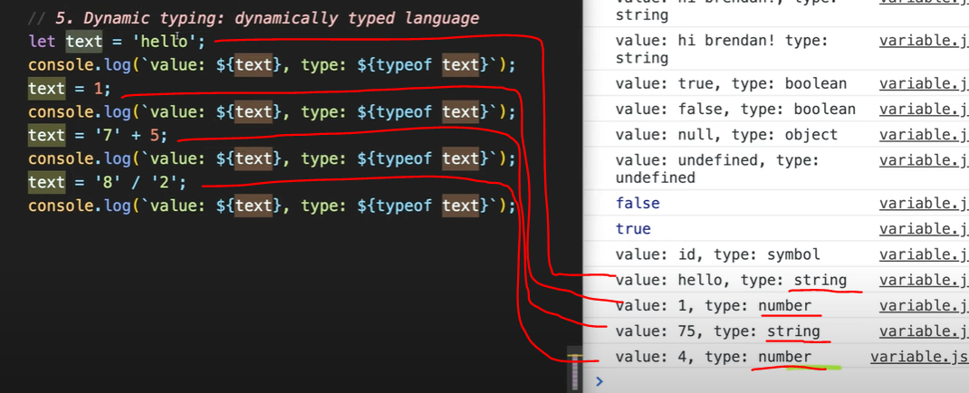 자바스크립트가 선언된 것을 읽어서 string인지 number인지 타입을 결정함.
