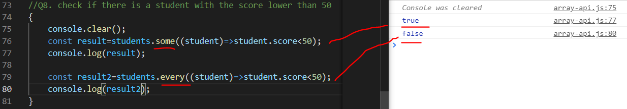 비슷한것으로 every가 있는데 every는 배열이 모두 조건에 충족해야지만 true가 리턴됨.