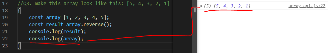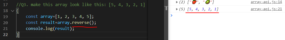 여기서 유념해야 할 것은 reverse는 함수를 호출한 배열 자체도 순서가 바뀐다.