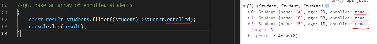 :수업에 등록한 학생들만(enrolled=true) 배열 함수로 만들어라.